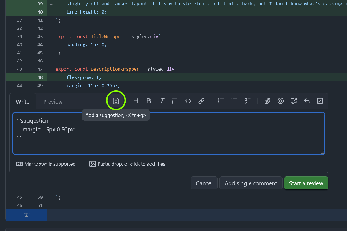 Używaj suggestion mode w GitHub. To pozwala autorowi zaakceptować poprawki jednym kliknięciem. Tryb sugestii to funkcja w popularnych narzędziach do code review, która pozwala recenzującemu zaproponować konkretną zmianę w kodzie. Autor PR-a może ją zaakceptować jednym kliknięciem, co automatycznie tworzy commit z poprawką. Jak to wygląda w praktyce? W GitHubie, podczas dodawania komentarza do linii kodu, możesz użyć specjalnej składni, aby zamienić go w sugestię.