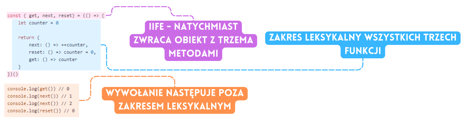 Nie daj się zwieść tym, że zwracamy obiekt, a nie funkcję. Metody w nim zawarte również utworzą domknięcie. W efekcie uzyskaliśmy prywatną zmienną counter, do której nie ma bezpośredniego dostępu, a jedynym sposobem na modyfikację lub odczytanie jest wykorzystanie jeden z trzech metod.