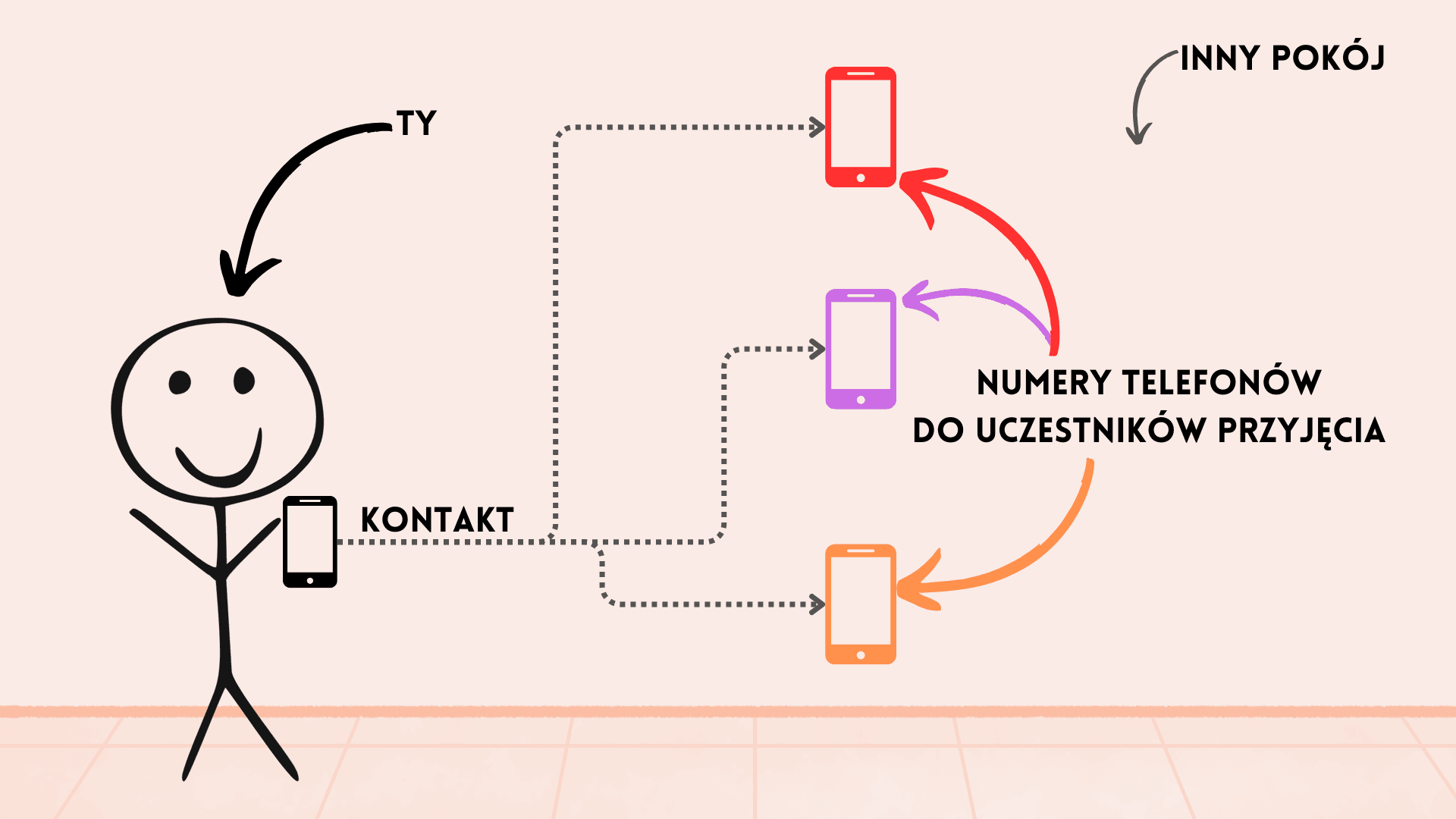 Rozbudujmy nieco ten przykład - przypuśćmy, że postanowiłeś opuścić imprezę i udać się do domu. Zanim jednak to zrobisz, żegnasz się ze wszystkimi. Zwróć uwagę, że na obrazku powyżej każdy z uczestników posiada telefon i przekazuje Ci jego numer. Możesz z niego skorzystać w każdej chwili, nawet po wyjściu z pokoju i w ten sposób uzyskać kontakt z daną osobą.