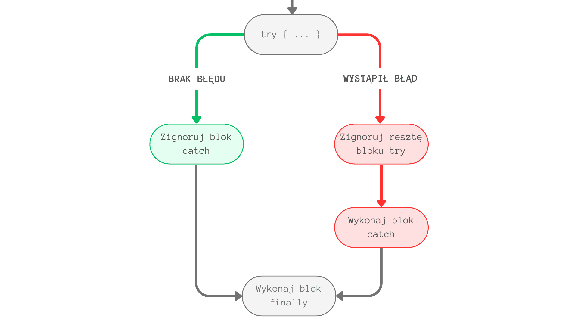 Ten blok może wystąpić bezpośrednio po bloku try (try...finally) lub po bloku catch (try...catch...finally). Kod wewnątrz niego zostanie zawsze wykonany, niezależnie od tego, czy w bloku w bloku try wystąpi błąd, czy nie. Ilustruje to poniższy diagram: