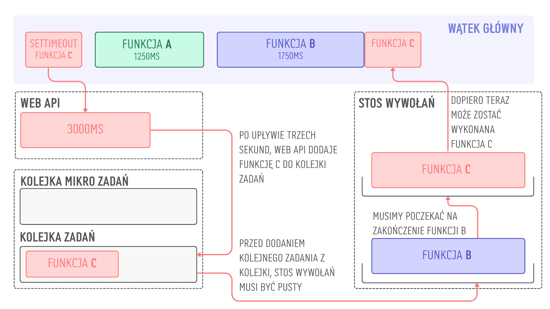 setTimeout, silnik nadal wykonuje inne instrukcje. Funkcja C musi zaczekać do momentu aż stos wywołań będzie pusty.