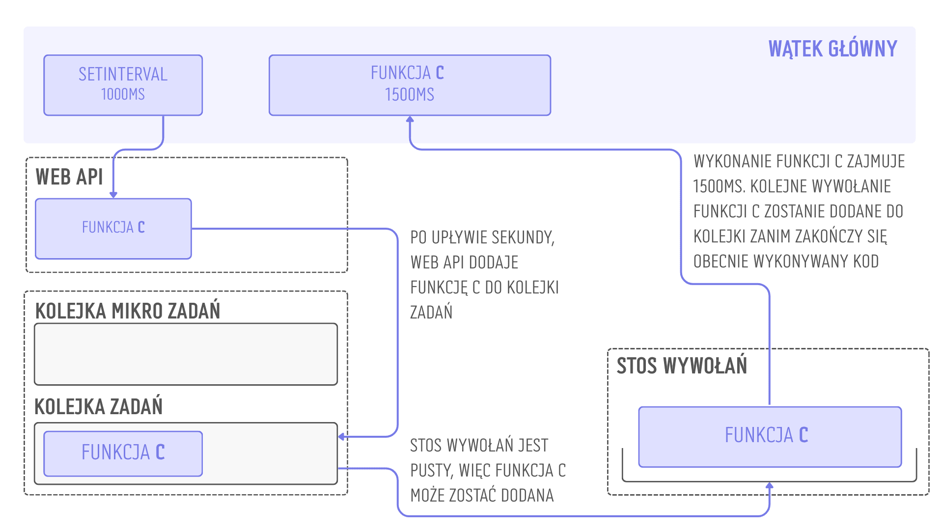 W środowisku przeglądarkowym obsługą setTimeout oraz setInterval zajmuje się WebAPI i to właśnie ten mechanizm powiadamia silnik JavaScriptu, że nadszedł czas na wykonanie funkcji. Może się jednak okazać, że w momencie, w którym powinna zostać wykonana funkcja asynchroniczna, silnik zajęty jest wykonywaniem innego kodu. W takim przypadku asynchroniczna funkcja oczekuje na swoją kolej w jeden z dwóch kolejek: mikro zadań lub (makro) zadań. W przypadku setTimeout i setInterval jest to ta druga. Następnie trafia ona na stos wywołań (ang. call stack). To jednak może nastąpić dopiero w momencie, w którym jest on pusty. Szczegółowe wyjaśnienie pętli zdarzeń znajdziesz w tym artykule.