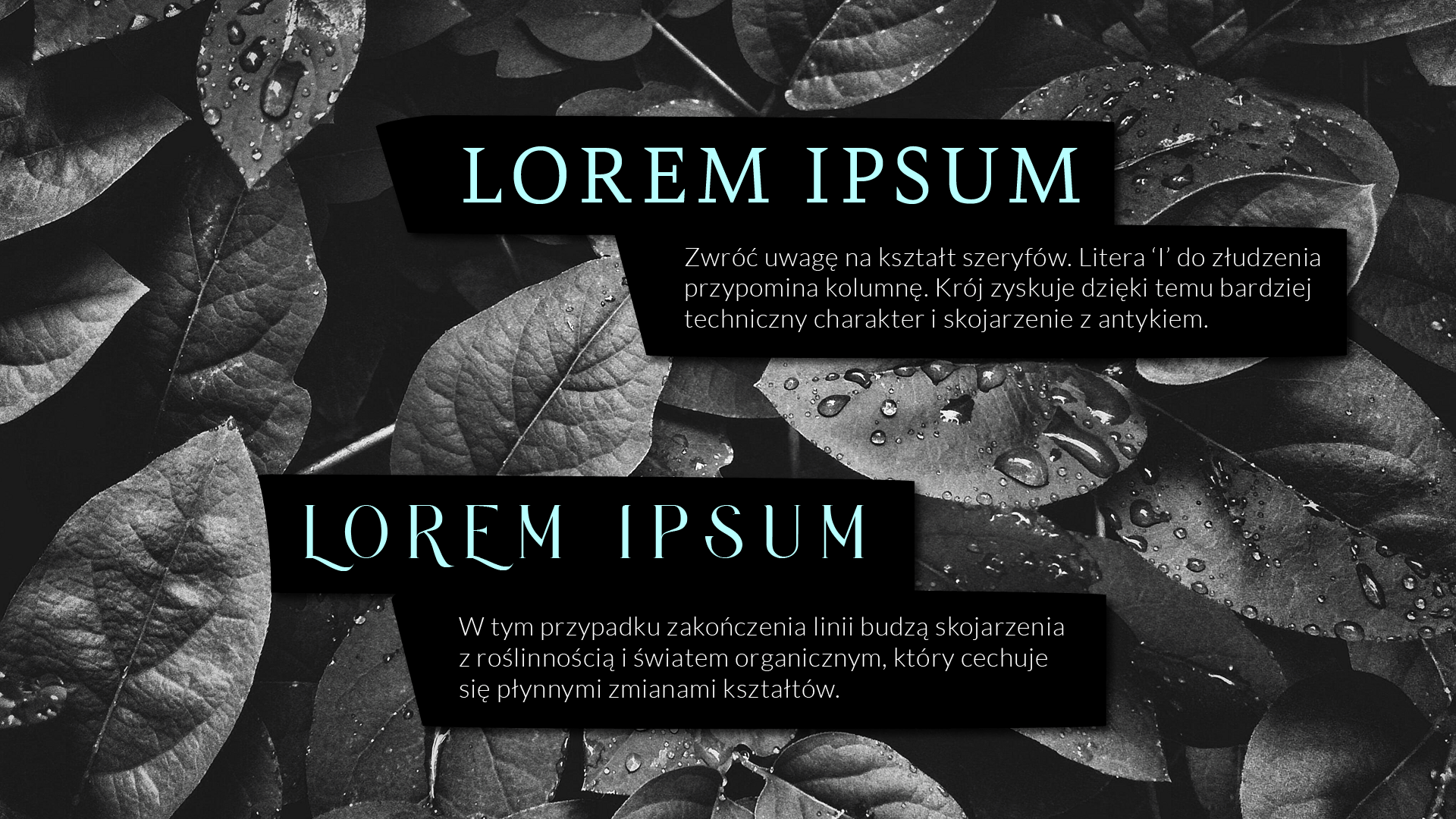 Dostosuj wielkość tekstu do rodzaju medium, na którym on występuje (strona internetowa, plakat, książka...). Ważne też, by zadbać o odpowiednią interlinię, odstępy między wyrazami, a także samymi glifami. Możesz w pewnym stopniu wpływać na tempo czytania, stosując bardziej lub mniej skondensowane pismo. Większe przestrzenie pomiędzy znakami dodadzą całej kompozycji lekkości i uspokoją rytm czytania.