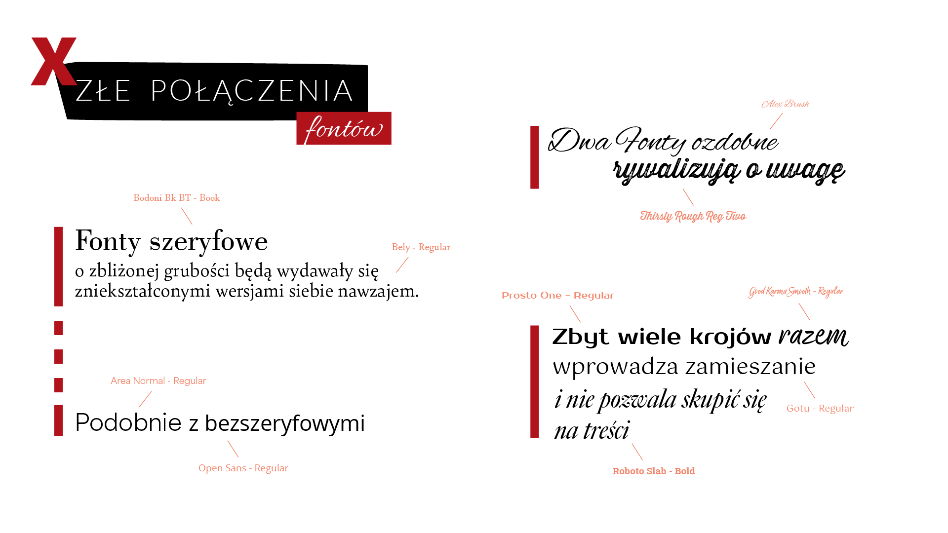 Odbiorca musi widzieć, że patrzy na odrębne style pisma. W innym wypadku będzie miał wrażenie pewnej niespójności. Może podświadomie odebrać nasze typograficzne zestawienie jako jeden font, ale w pewnych fragmentach lekko zniekształcony.
