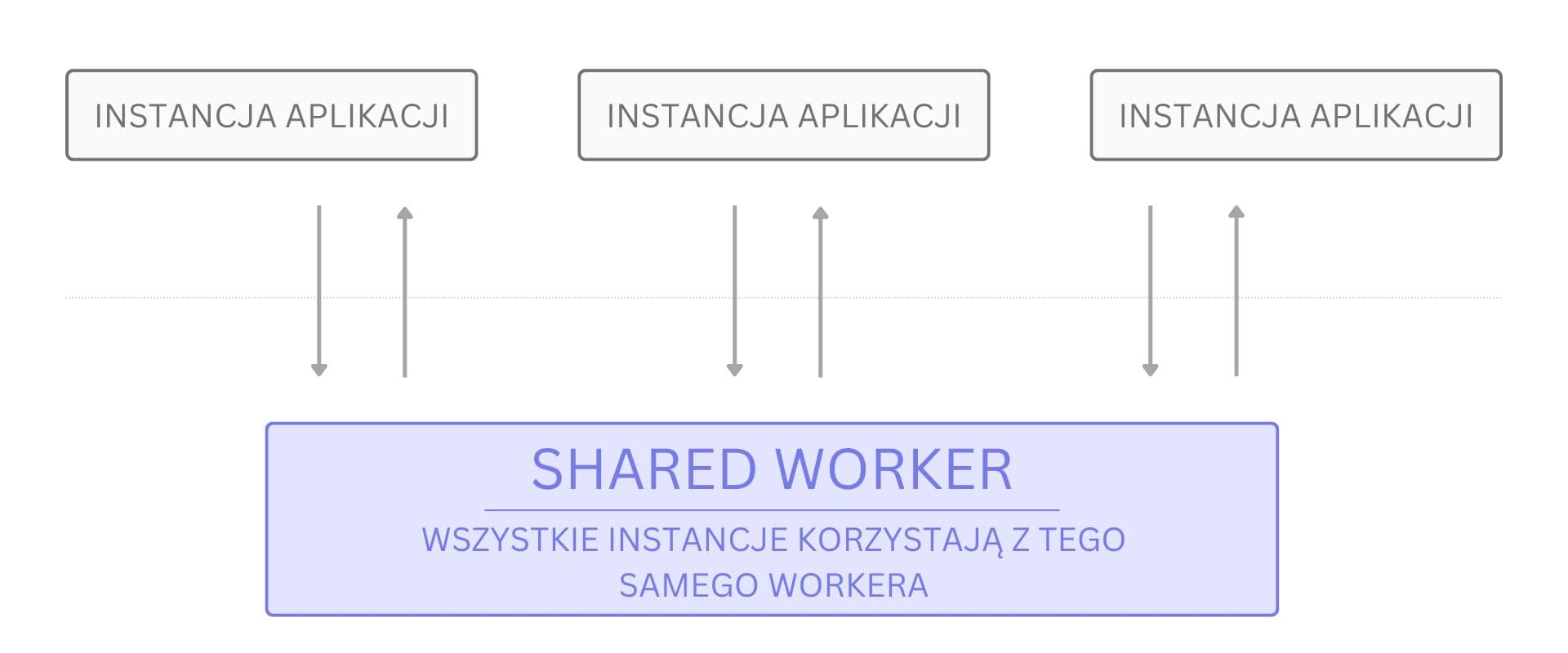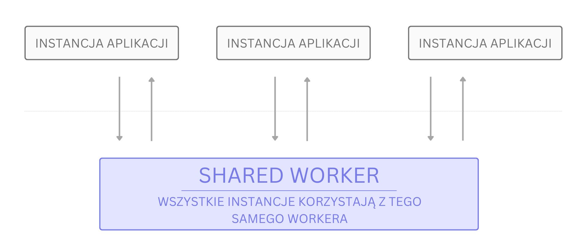 Prawdopodobnie najrzadziej wykorzystywany z workerów. Jak sama nazwa wskazuje, jest on dzielony pomiędzy wieloma instancjami tej samej strony. Najczęściej wykorzystuje się go do synchronizacji stanu lub innych danych, które powinny być spójne w każdej otwartej karcie lub oknie. Spotkałem się również z wykorzystaniem tego typu workera do wykonywania cyklicznych zapytań do serwera, żeby uniknąć ich powielania w przypadku wielokrotnego otwarcia aplikacji. Muszę się jednak przyznać, że do tej pory sam nie wykorzystałem go ani razu w komercyjnym projekcie.
