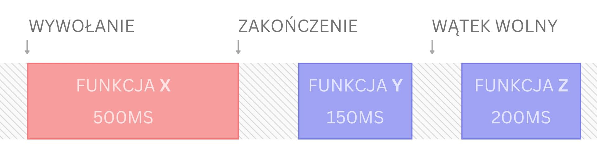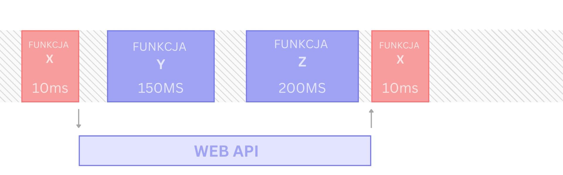 Takie zachowanie może okazać się problematyczne, jeżeli natrafimy na fragment kodu, którego wykonanie zajmuje 500ms (w świecie frontendu jest to wartość niezwykle duża 😉). Przykładem takiej funkcji może być zapytanie do serwera. Wykonujemy zapytanie, a następnie czekamy na odpowiedź. Gdy ją otrzymamy, wyświetlamy ją użytkownikowi.