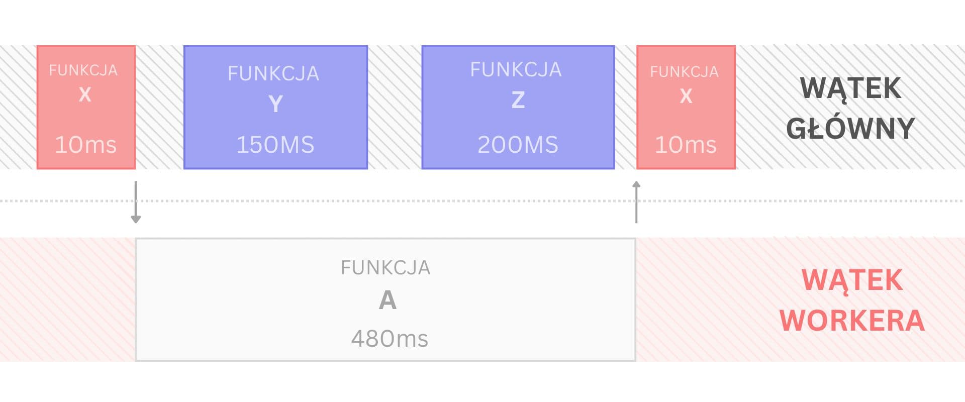 Co jednak zrobić, jeżeli nasza funkcja w ogóle nie wykonuje zapytania, a jedynie skomplikowane obliczenia, które trwają również 500ms? W takim przypadku nie możemy zastosować kodu asynchronicznego, ponieważ wszystkie nasze obliczenia są synchroniczne. Rozwiązaniem tego problemu jest zastosowanie Web Workera i oddelegowanie wszystkich obliczeń do osobnego wątku.