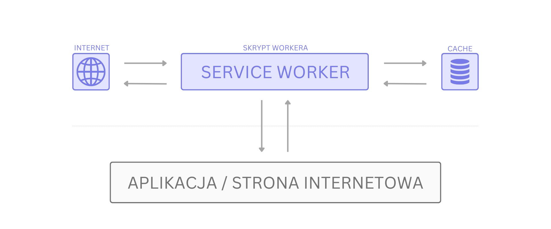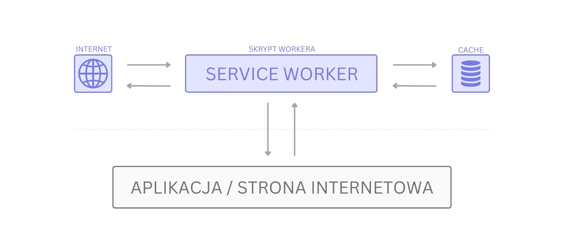 Podsumowując: Service Worker zachowuje się jak osobna aplikacja działająca niezależnie od strony internetowej. Potrafi pozostawać aktywny, nawet wtedy, gdy użytkownik nie korzysta obecnie z naszej witryny. Pełni rolę proxy, chroniącego dostępu do strony, potrafi przechwytywać zapytania HTTP, wysyłać powiadomienia push, a także zapisywać w pamięci pobrane wcześniej zasoby, co umożliwia ich wyświetlanie nawet w trybie offline.